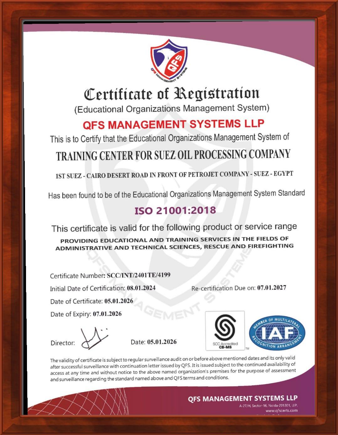 وتأكيدا علي حرص الشركة علي ابراز دور العنصر البشري كركيزة أساسية لتحقيق اهداف التطوير والاستدامة بالقطاع وبرعاية السيد الكيميائي هشام فتحي رئيس مجلس الادارة نجحت الشركة في الحصول علي شهادتي 9001-ISO & 21001-ISO والتجديد لهما للعام الثالث علي التوالي وأكد السيد رئيس مجلس الإدارة ان شهادة 9001-ISO تعكس التزام الشركة بتطبيق نظام متكامل لادارة الجودة يضمن ضبط الاجراءات ورفع كفاءة ألاداء فيما تمثل شهادة 21001-ISO التزاما واضحا بتطوير منظومة عمليات الشركة وبناء كوادر مؤهلة قادرة علي دعم خطط التطوير في جميع مواقع العمل بما يضمن استمرارية التحسين والتطوير واعداد كوادر مؤهلة لتبادل الخبرات بما يحقق اهداف الشركة نحو مستقبل اكثر كفاءة واستدامة وتؤكد شركة السويس لتصنيع البترول التزامها الراسخ بتحقيق التميز المؤسس وتعزيز الاداء المستدام