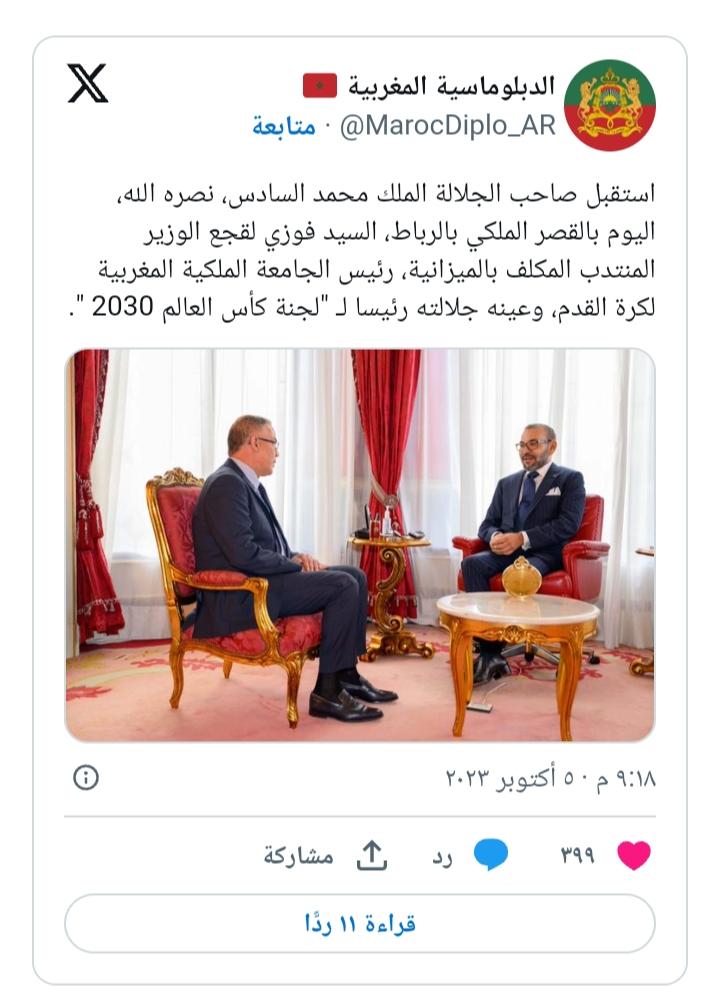 وذكر بيان للديوان الملكي، أن محمد السادس استقبل في القصر الملكي بالعاصمة الرباط، فوزي لقجع وعينه رئيسا للجنة كأس العالم 2030.