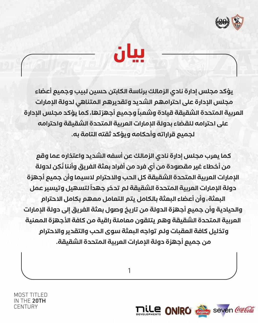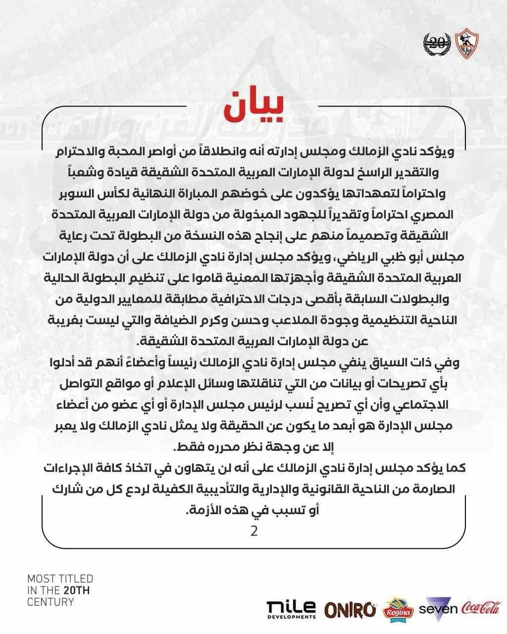 يؤكد نادي الزمالك ومجلس إدارته أنه انطلاقًا من أواصر المحبة والاحترام والتقدير الراسخ لدولة الإمارات الشقيقة قيادة وشعباً واحتراماً لتعهداتها يؤكدون خوضهم المباراة النهائية لكأس السوبر المصري احترامًا وتقديرًا للجهود المبذولة من دولة الإمارات العربية المتحدة الشقيقة وتصميمًا منهم على إنجاح هذه النسخة من البطولة تحت رعاية مجلس أبو ظبي الرياضي.