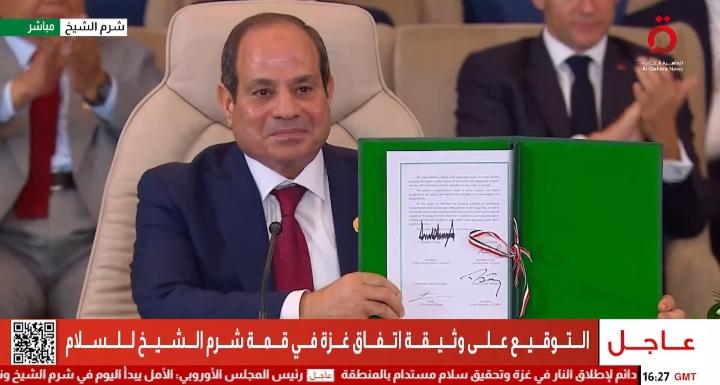 ووقع السيد الرئيس عبد الفتاح السيسي، والرئيس الأمريكي، دونالد ترامب على اتفاقية شرم الشيخ للسلام، شاملة لإنهاء الحرب في قطاع غزة. كما وقع قادة كل من وقطر وتركيا يوقعون وثيقة بشأن الاتفاق بين إسرائيل وحماس.