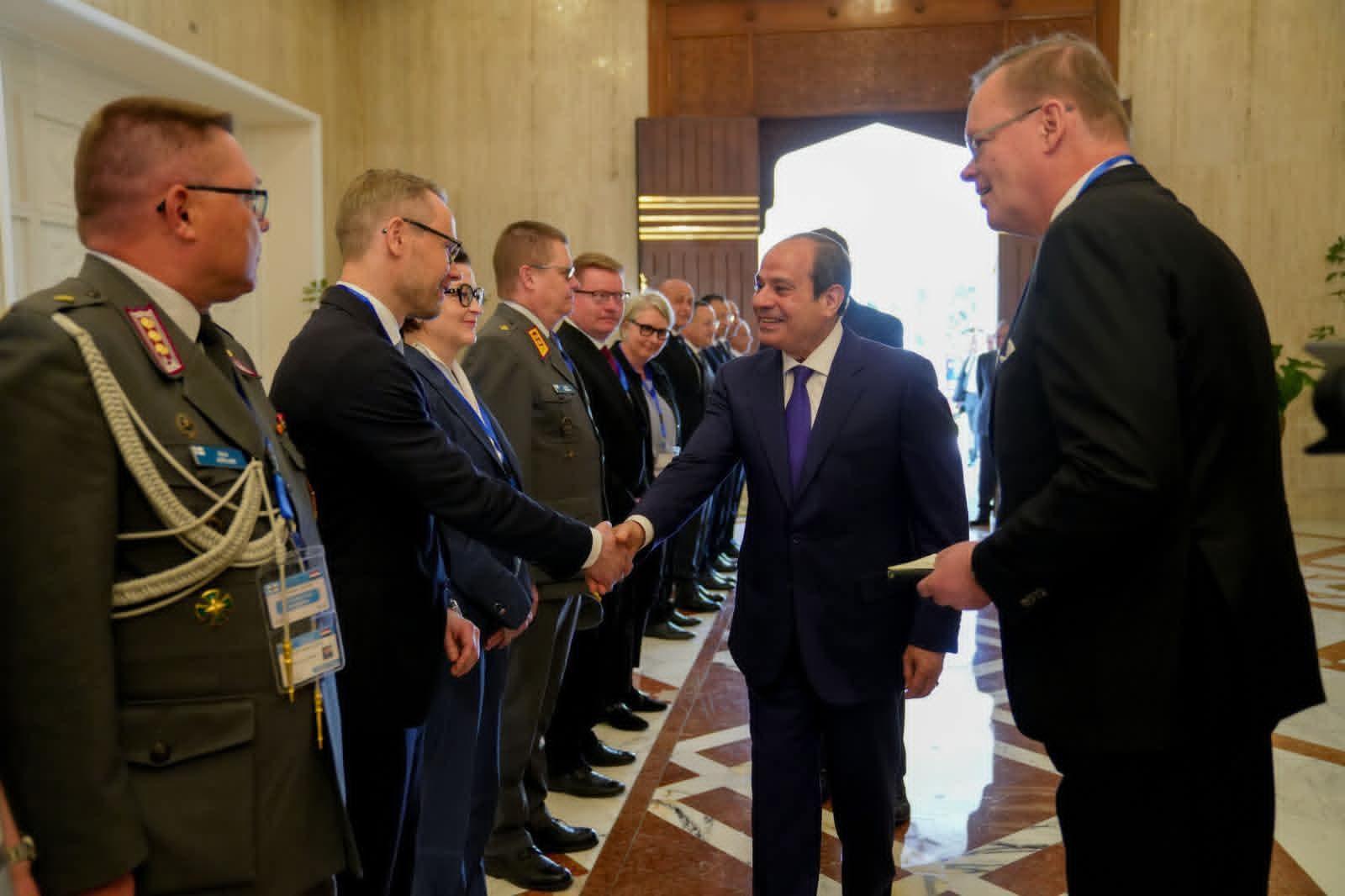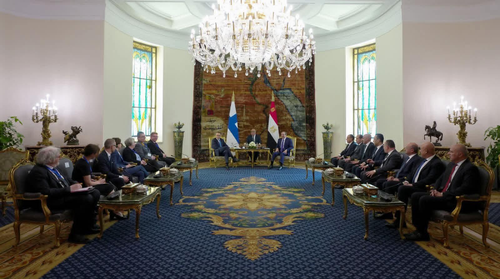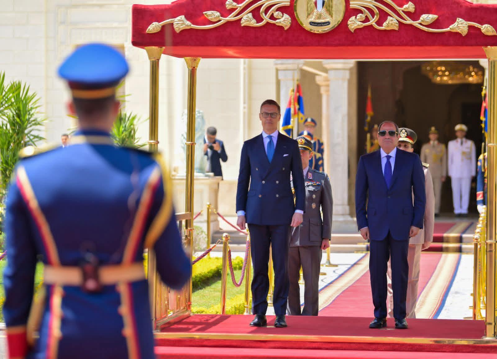 وصرح المتحدث الرسمي باسم رئاسة الجمهورية بأن مراسم الاستقبال شملت قيام حرس الشرف بأداء التحية، وعزف الموسيقى للسلام الوطني للبلدين، والتقاط صورة تذكارية، أعقبها لقاء ثنائي بين السيد الرئيس والرئيس الفنلندي، ثم جلسة مباحثات موسعة بحضور وفدي البلدين، تلتها مأدبة غداء أقامها السيد الرئيس تكريمًا للرئيس الفنلندي والوفد المرافق. وأشار السفير محمد الشناوي، المتحدث الرسمي، إلى أن السيد الرئيس رحب بزيارة الرئيس الفنلندي إلى مصر، مؤكدًا سيادته اعتزاز مصر بالعلاقات الثنائية مع فنلندا، ومشيرًا إلى أهمية مواصلة العمل بين الجانبين بهدف تطويرها في مختلف المجالات، بما في ذلك المجالات السياسية، والاقتصادية والتجارية. ومن جانبه، أعرب الرئيس الفنلندي عن اعتزازه بزيارة مصر ولقاء السيد الرئيس، مؤكدًا تقديره لحُسن الاستقبال وكرم الضيافة، ومشيرًا إلى حرص الجانب الفنلندي على تطوير العلاقات الثنائية مع مصر والانتقال بها إلى آفاق أرحب استناداً إلى ما تمتلكه مصر وفنلندا من مقومات تسمح بدفع العلاقات الثنائية في العديد من المجالات، فضلاً عن التشاور مع السيد الرئيس إزاء الأزمات الإقليمية والدولية ذات الاهتمام المشترك. وفي هذا السياق، نوه الرئيس الفنلندي بحرصه على اصطحاب وفد من رواد الأعمال الفنلنديين لبحث فرص استفادة الشركات الفنلندية من مناخ الاستثمار في مصر. وذكر المتحدث الرسمي أنه في أعقاب المباحثات، عقد الرئيسان مؤتمرًا صحفيًا مشتركًا، وفيما يلي نص كلمة السيد الرئيس في المؤتمر الصحفي: "فخامة الرئيس ألكسندر ستوب رئيس جمهورية فنلندا، السيدات والسادة الحضور، إنه لمن دواعي سروري أن أرحب بفخامة الرئيس "ألكسندر ستوب" والوفد المرافق له في القاهرة، في زيارة هي الأولى لرئيس فنلندي إلى مصر منذ سنوات، مما يضفي طابعاً خاصاً عليها لما تعكسه من عمق العلاقات بين مصر وفنلندا، فضلاً عما تعكسه من إرادة سياسية مشتركة للدفع بتلك العلاقات نحو آفاق أرحب، بما يحقق مصالح شعبينا الصديقين، ويُسهم في دعم التنمية والاستقرار إقليميًا ودوليًا. لقد عقدنا مباحثات معمقة وبنّاءة حول مختلف أوجه التعاون الثنائي، وتشاورنا وتبادلنا وجهات النظر حول مستجدات الأوضاع الإقليمية والدولية، حيث توافقنا على ضرورة البناء على ما تحقق من تعاون خلال السنوات الماضية، والعمل على استكشاف فرص ومجالات جديدة للشراكة بيننا، بما يعكس الإمكانات الكبيرة التي يمتلكها البلدان. كما أكدنا خلال مباحثاتنا على ضرورة تعزيز التعاون الاقتصادي والتجاري والاستثماري، وخلق بيئة مواتية لزيادة حجم التبادل التجاري بين مصر وفنلندا، وتشجيع الاستثمارات المتبادلة، فضلاً عن دعم التواصل بين مجتمعي الأعمال في البلدين. وفي هذا السياق، فإنني أثمن اصطحاب فخامة الرئيس لوفد رفيع من رجال الأعمال والمستثمرين الفنلنديين، بما يعكس الاهتمام بتعزيز العلاقات الاقتصادية والتجارية بين البلدين، واتخاذ خطوات ملموسة في هذا الاتجاه، خاصة في ضوء ما تشهده مصر من فرص استثمارية واعدة وتطور غير مسبوق في مشروعات البنية التحتية. كما ناقشتُ وفخامة الرئيس "ألكسندر ستوب" سبل تعزيز التعاون في عدد من القطاعات، لاسيما تلك التي تتمتع فيها فنلندا بخبرات رائدة، مثل الاتصالات وتكنولوجيا المعلومات، والتحول الرقمي، والطاقة المتجددة، والتعليم، والرعاية الصحية، والصناعات المتقدمة، والصناعات الخشبية، والتعدين. وأكدنا أهمية تبادل الخبرات وبناء القدرات، بما يدعم جهود مصر في تطوير منظومة التعليم، وتعزيز كفاءة الأداء المؤسسي. كما تطرقت المباحثات إلى التعاون بين مصر والاتحاد الأوروبي، حيث أكدنا أهمية الشراكة الاستراتيجية بين مصر والاتحاد الأوروبي، والدور الذي يمكن أن تضطلع به فنلندا في دعم هذه الشراكة وتطويرها. السيدات والسادة، تناولت المباحثات كذلك عدداً من القضايا الإقليمية والدولية، خاصة ما يتعلق بالشرق الأوسط، الذي يشهد العديد من التطورات التي امتدت ت