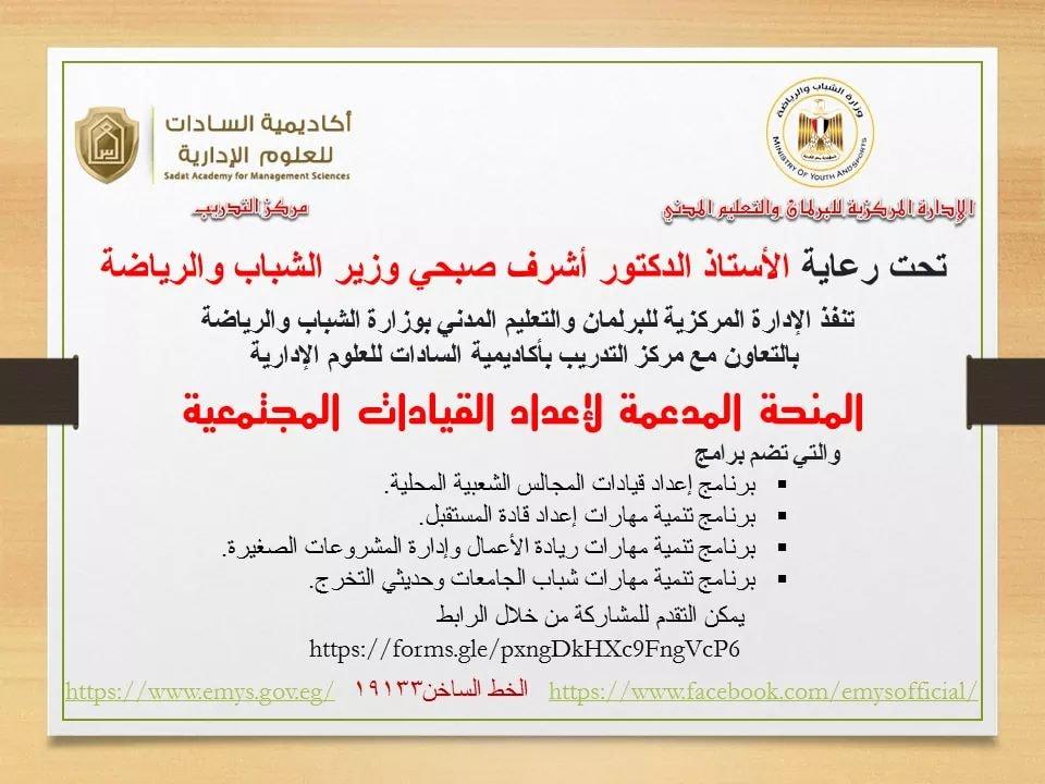 تعلن وزارة الشباب والرياضة عن إنطلاق المنحة المدعمة لإعداد القيادات المجتمعية بالتعاون مع أكاديمية السادات للعلوم الإدارية خلال الفترة من نوفمبر 2019 حتى مارس 2020 ،وذلك بعد النجاح الذي حققته المنحة في السنوات السابقة منذ 2016 حتى الآن .
